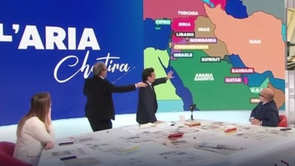 La scena è andata in onda durante “L’aria che tira”, il programma di approfondimento politico di La7 condotto da David Parenzo, uno dei talk mattutini più seguiti nel panorama televisivo italiano. In studio si discuteva della guerra in Medio Oriente e delle tensioni con l’Iran, con il conduttore impegnato a spiegare ai telespettatori le relazioni tra i Paesi dell’area utilizzando una cartina geografica. L’aria che tira