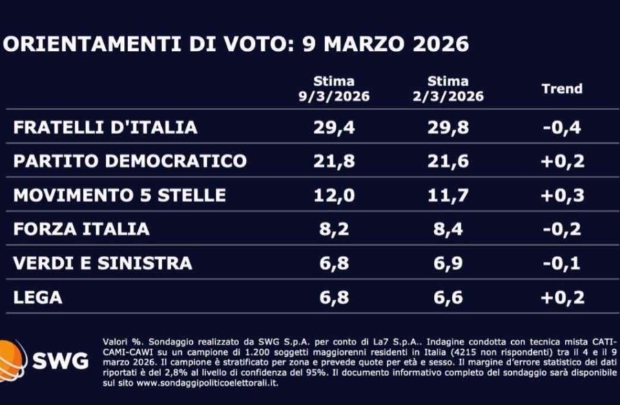 La politica italiana continua a muoversi rapidamente, anche mentre lo scenario internazionale resta segnato da tensioni e crisi geopolitiche. L’ultimo sondaggio realizzato da SWG per il TG La7, datato 9 marzo 2026, offre una fotografia aggiornata degli orientamenti elettorali nel Paese.