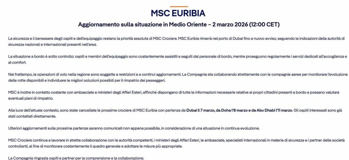 Anche TUI Cruises e Celestyal Cruises hanno confermato che al momento non è previsto il rimpatrio dei passeggeri, mentre le autorità di Dubai non consentono lo sbarco per ragioni di sicurezza. I passeggeri sono invitati a restare nelle aree interne delle navi e la compagnia assicura che fino al ritorno in sicurezza continuerà a garantire assistenza e protezione.
