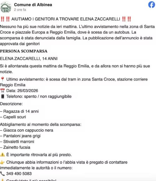 La famiglia, residente nel comune di Albinea, chiede massima attenzione e collaborazione. Chiunque ritenga di aver visto una ragazza compatibile con la descrizione o con lo zaino indicato è invitato a contattare immediatamente le forze dell’ordine, fornendo orari, luoghi precisi e ogni dettaglio utile alla ricostruzione.