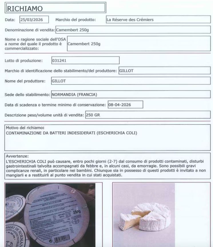 Secondo quanto riportato nell’avviso, il provvedimento è legato al sospetto di contaminazione da Escherichia coli. Il formaggio è attribuito alla produzione della Fromagerie Gillot, azienda con sede in Normandia specializzata in lavorazioni a base di latte crudo.