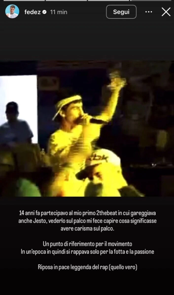 Nel suo messaggio, Fedez non ha solo condiviso il dolore, ma ha anche riacceso la scintilla dei giorni in cui la passione per il rap era tutto. “Vederlo sul palco mi fece capire cosa significasse avere carisma sul palco”, ha scritto, ricordando il suo primo incontro con la potenza della scena durante una delle edizioni storiche di 2theBeat. In quelle serate, il freestyle era un rito, un atto di fede e sincerità. E Jesto, microfono in mano, sapeva trasformare ogni strofa in un’esplosione di energia viscerale.