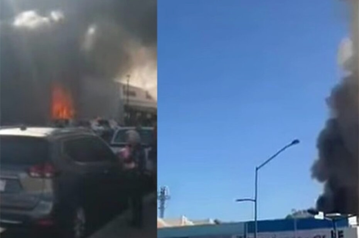 Squadre di soccorso al lavoro davanti al supermercato in fiamme a Hermosillo