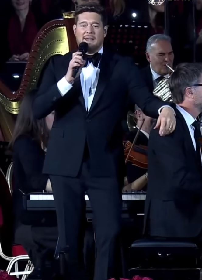 Quando Michael Bublé è apparso sul palco, l’atmosfera è cambiata ma senza spezzare la continuità spirituale dell’evento: una transizione morbida, quasi naturale, che ha unito mondi diversi in un’unica vibrazione collettiva.