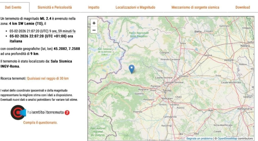 Una scossa di terremoto di magnitudo ML 2.4 è stata rilevata nella tarda serata di mercoledì 5 febbraio 2026 nel settore montano del Torinese, con interessamento dell’area a sud-ovest di Lemie, in provincia di Torino. Si tratta di un episodio di intensità contenuta, inserito nel quadro della normale attività sismica delle zone alpine piemontesi.