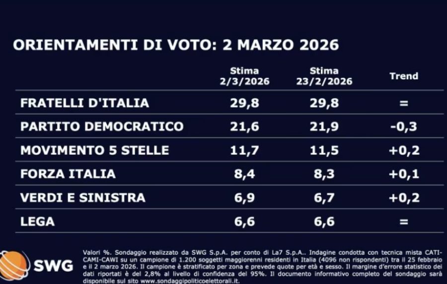 A completare il quadro c’è il dato sugli indecisi e sull’astensione potenziale. Il 28% dell’elettorato dichiara di non esprimere alcuna preferenza: un valore in crescita dell’1% rispetto alla precedente rilevazione. Un bacino ampio che, in vista del referendum sulla Giustizia, potrebbe diventare decisivo.
